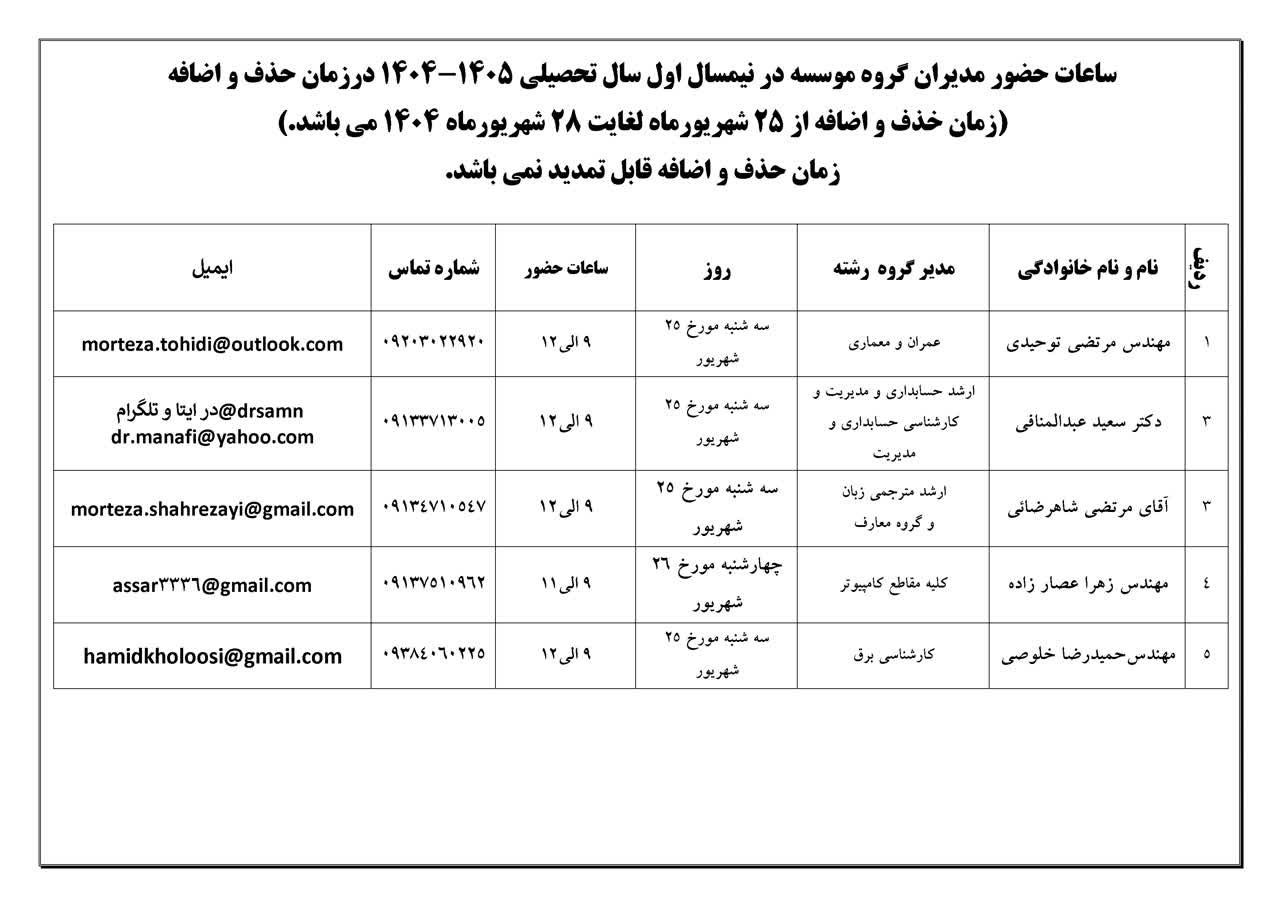 ساعات حضور مدیران گروه در نیمسال اول 1405-1404در زمان حذف و اضافه